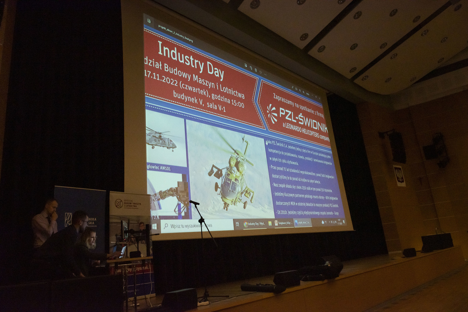 Przedstawiciele PZL-ŚWIDNIK a LEONARDO HELICOPTERS company opowiedzieli o kluczowych obszarach działalności firmy, tj. o Centrum Doskonałości Struktur Lotniczych, działach badawczo-rozwojowych, śmigłowcach, wsparciu klienta, szkoleniach. Przedstawili również specyfikę pracy w firmie, ofertę praktyk i staży dla studentów i uczniów odnośnie praktyk i staży oraz konkurs wiedzy z atrakcyjnymi nagrodami dla zwycięzców.
